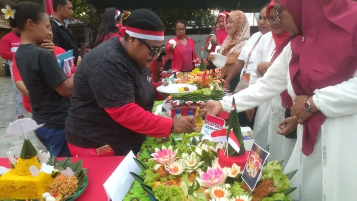 Para peserta tampak antusias menampilkan karya terbaik mereka dengan beragam bentuk hiasan nasi tumpeng yang sarat makna. Kreasi yang ditampilkan mulai dari ornamen bernuansa merah putih hingga simbol-simbol kebersamaan dan keberagaman.