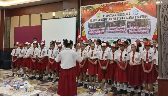 Lagu Laskar Pelangi yang dipopulerkan oleh grup band asal Bandung, Nidji menjadi salah satu persembahan dalam acara Penamatan dan Perpisahan Kelas VI SDN I Abepura Tahun Ajaran 2023/2024 di @Home Hotel, Distrik Abepura, Kota Jayapura, Papua, Senin pagi 10 Juni 2024.