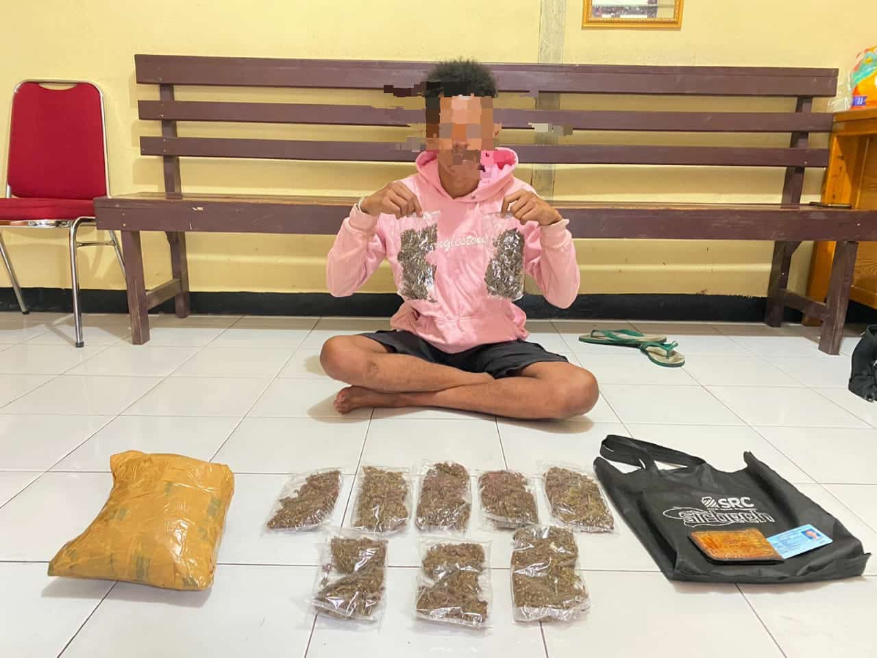 “Anggota melihat tersangka berjalan keluar dari area pelabuhan dengan gerak-gerik yang mencurigakan sehingga anggota langsung menghentikan tersangka dan pada saat dilakukan pemeriksaan barang bawaan tersangka ditemukan di dalam sebuah kantong plastik berwarna hitam milik tersangka yg mana didalamnya di temukan 1(satu) bungkus plastik yang di lakban menggunakan lakban berwarna cokelat dan pada saat di buka ditemukan 10 (sepuluh) bungkus plastik bening yang diduga jenisnya adalah daun ganja kering,” ungkap Kasat Resnarkoba.