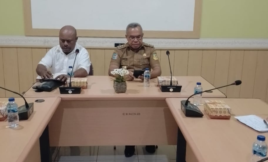 BeritaPapua.co, Serui — Penjabat Bupati Kepulauan Yapen, Cyfrianus Mambay gelar pertemuan dengan Kepala dinas Pendidikan Zakaria Sanuari dan kepala – kepala distrik, Senin 20/02/2023.