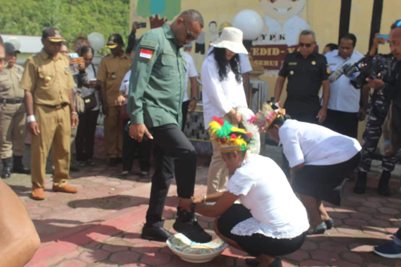 Setibanya di SD YPK Yedidyah, Anggota DPR Fraksi Gerindra ini disambut dengan tarian dari anak-anak sekolah dasar diiringi prosesi adat injak piring Yang selanjutnya diantar menuju lokasi SMP Negeri Serui Laut yang berada diatas perbukitan.