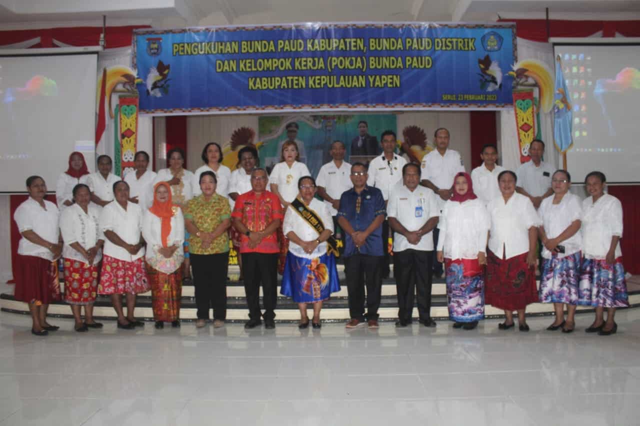 BeritaPapua.co, Serui — Bunda Paud tingkat Kabupaten dan distrik serta kelompok kerja (Pokja) paud di Kepulauan Yapen secara resmi di Lantik Penjabat Bupati Cyfrianus Y Mambay di gedung Silas Papare, Kamis (23/2/ 2023)