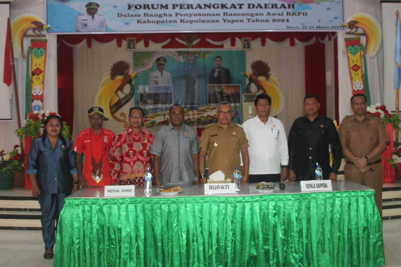 BeritaPapua.co, Serui.co — Guna mempertajam penyusunan rencana kerja (Renja) tahun 2024, pemerintah daerah kabupaten kepulauan Yapen menggelar Forum Perangkat Daerah dalam rangka Penyusunan Rancangan Awal RKPD Kabupaten Kepulauan Yapen Tahun 2024, Senin (20/3/2023).