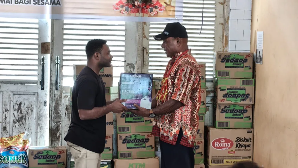 Berita Papua, Jayapura — Ondofolo Kampung Yoka, David Mebri, melakukan kunjungan kasih dalam rangka menyalurkan bantuan sosial berupa paket sembako kepada mahasiswa di Asrama Putra-Putri Mahasiswa Manokwari Papua Barat yang berlokasi di Padang Bulan, Distrik Heram, Kota Jayapura, Senin (15/12/2025).