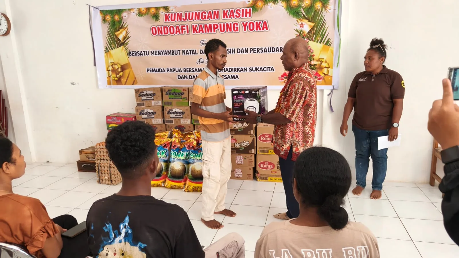 “Dalam suasana Natal tahun ini, kami dari tokoh adat, tokoh agama, dan tokoh pemuda yang ada di Kampung Yoka memberikan sedikit bantuan kepada adik-adik di asrama sebagai bentuk kepedulian dan kasih Natal,” ujar David Mebri dalam sambutannya.