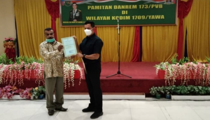 Pada kesempatan itu, Brigjen TNI Iwan Setiawan menerima penghargaan dari lembaga masyarakat adat (LMA) Kabupaten Waropen berupa piagam yang diserahkan langsung ketua LMA Waropen Baren Agaki.