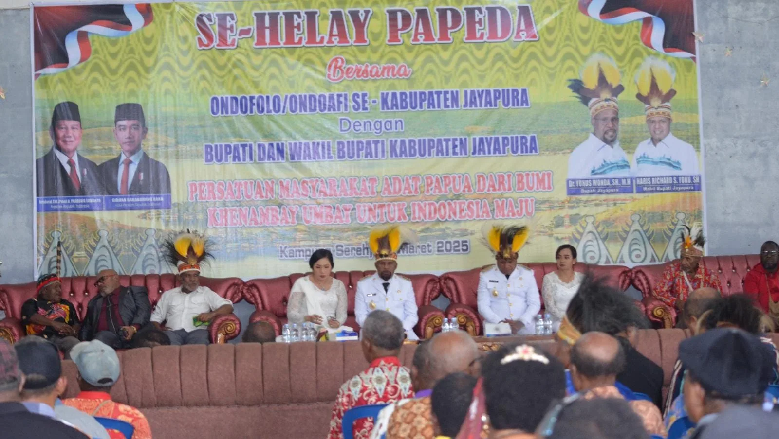 Bupati dan Wakil Bupati Jayapura yang baru ini sebelum ditetapkan oleh Dewan Perwakilan Rakyat Kabupaten (DPRK) Kabupaten Jayapura dalam rapat Paripurna, menyempatkan diri ke Pendopo Heleybhey Obhe Kampung Sereh untuk makan Papeda se-Helay bersama Ondofolo/Ondoapi dan para kepala suku, Selasa (25/03/2025).