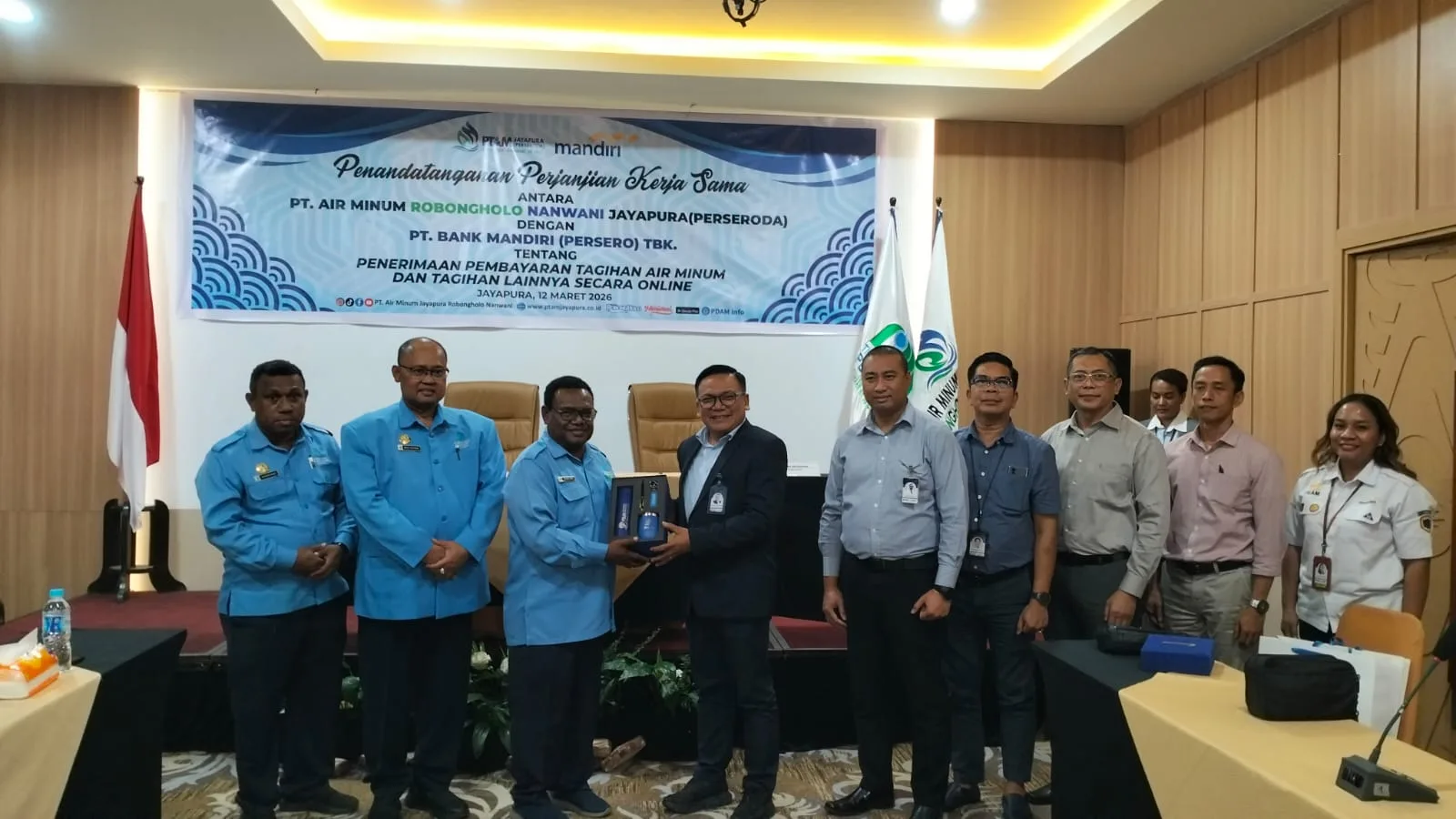 Berita Papua, Jayapura — PT Air Minum Jayapura Robongholo Nanwani (Perseroda) menandatangani perjanjian kerja sama (PKS) dengan PT Bank Mandiri (Persero) Tbk terkait penerimaan pembayaran tagihan air minum dan tagihan lainnya secara online.