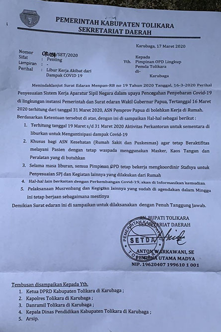 Merujuk surat Menpan RB RI dan Surat Gubernur Papua untuk mencegah merebaknya wabah virus corona (covib-19) pimpinan daerah mengabil langkah pencegahan yang cepat,tepat,dan efektif. Karena itu sesuai dengan hasil koordinasi dengan Pimpinan Daerah bahwa para ASN dan para pelajar dari tingkat PAUD,TK,SD,dan SMP,serta SMA dan sederajat diliburkan selama 2 pekan sejak rabu,18 maret hingga rabu,01 april 2020. Hal tersebut disampaikan Sekda Tolikara Anton warkawani,SE usai pimpin apel pagi di halaman Kantor Bupati di karubaga rabu,18/03/2020 kemarin lalu.