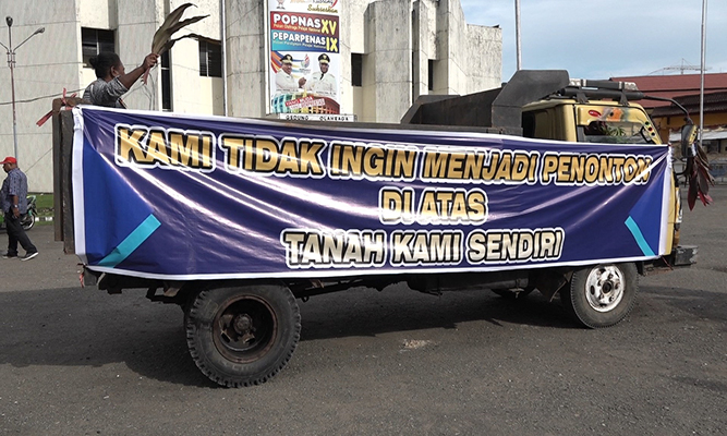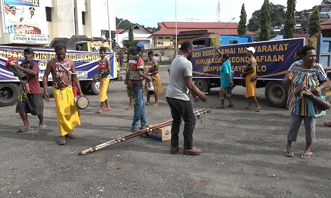 Untuk diketahui cara melakukan aksi demo damai ini terbilang unik dan tidak seperti biasanya para pendemo lainnya, dengan menggunakan kendaraan roda enam (Truck) dan beberapa kendaraan minibus mereka bernyanyi dan menari menggunakan alat musik tradisional hingga busana tradisional dengan cara berkeliling Kota Jayapura hingga berkumpul di GOR Cendrawasih.