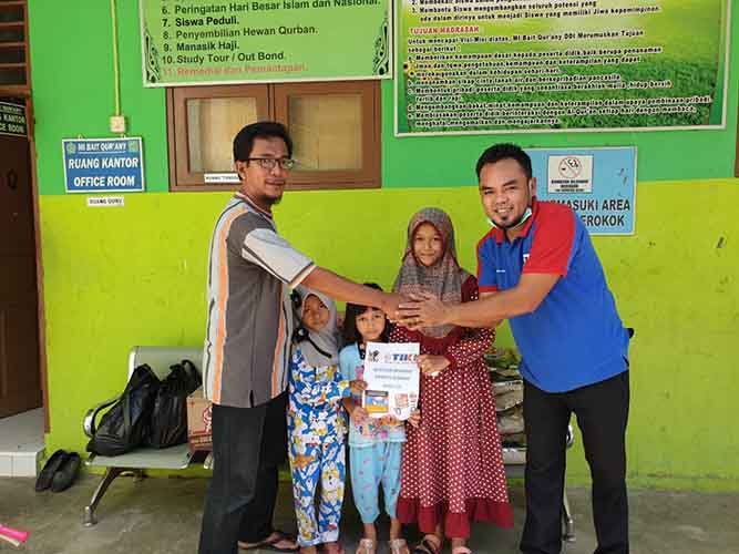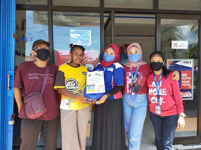 Disposori oleh Pimpinan pusat, PT Citra Van Titipan Kilat (TIKI), Hj Nuraini dan pimpinan TIKI Biak (Nabil Abstrak Game) Ahmad Zulhaji membagikan paket tersebut.