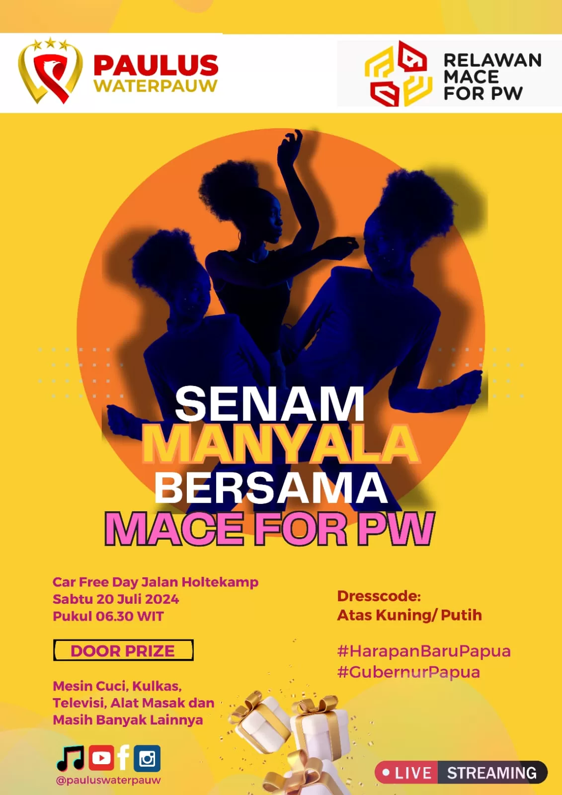 Berita Papua, Jayapura — Relawan MACE PAPUA for PW (Paulus Waterpauw) mengajak masyarakat Kota dan Kabupaten Jayapura dan sekitarnya bergabung untuk Senam Manyala Bersama MACE for PW.
