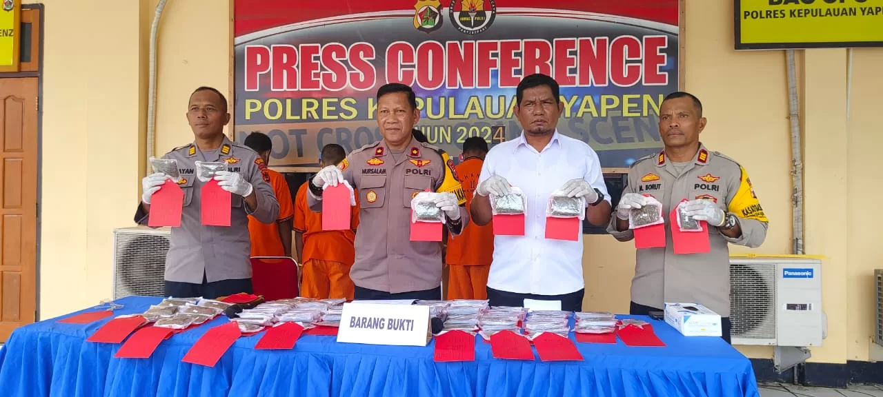 BeritaPapua.co, Serui — Polres Kepulauan Yapen berhasil menangkap 5 orang tersangka kasus pengedar narkotika jenis ganja seberat 2.424,6 gram. Pengungkapan kepemilikan barang haram ini diawali dari kasus pertama terjadi pada tanggal 19 Februari 2024 di pelabuhan Serui.