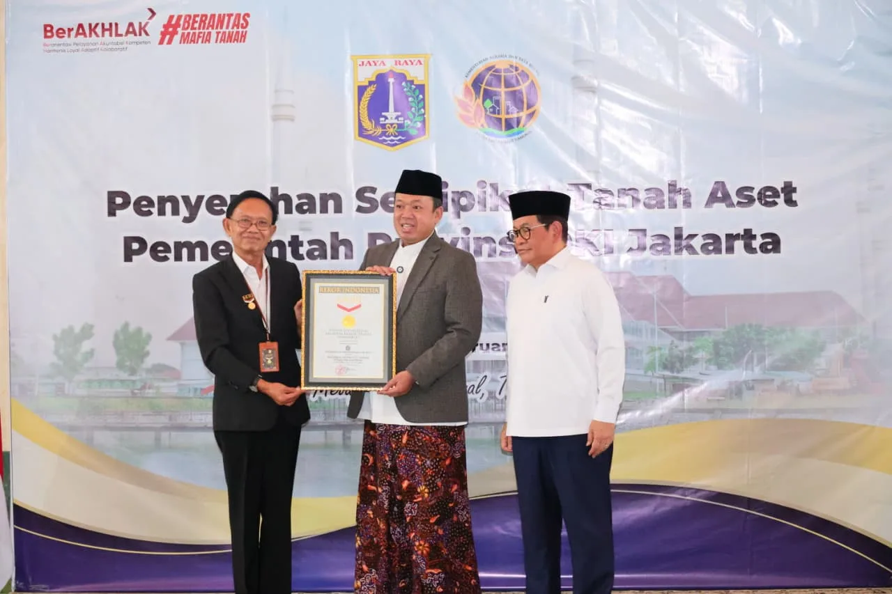 Menteri Nusron mengapresiasi sinergi antara Pemerintah Provinsi DKI Jakarta dan jajaran Kantor Wilayah BPN Provinsi DKI Jakarta yang telah bekerja keras menuntaskan proses sertipikasi aset tersebut.