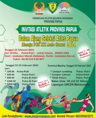 BeritaPapua.co, Jayapura — Dalam ajang melakukan seleksi atlet Papua menuju Pekan Olahraga Nasional (PON) XXI Aceh-Sumatera Utara 2024 mendatang, Persatuan Atletik Seluruh Indonesia (PASI) provinsi Papua menggelar lomba lari.
