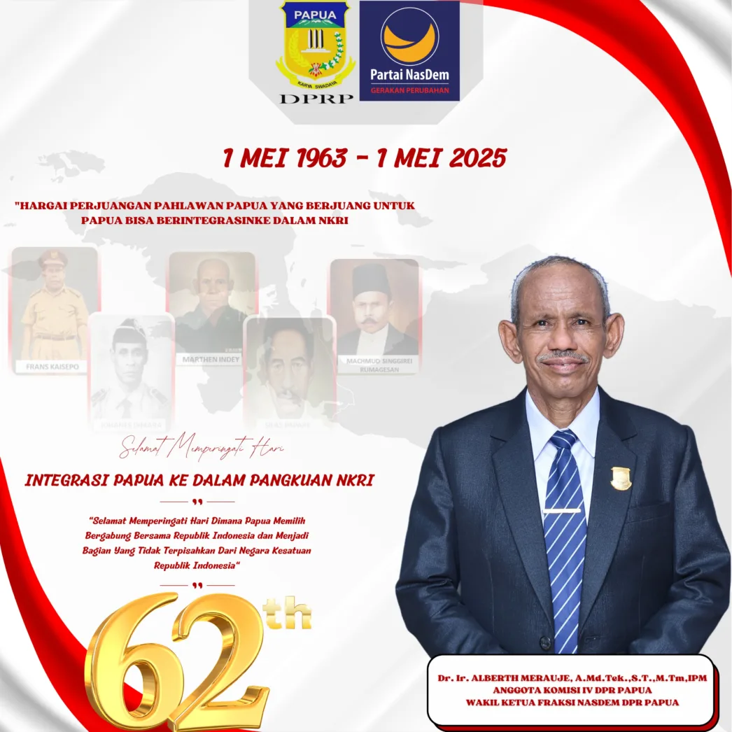 Berita Papua, Jayapura — Dalam rangka memperingati 62 tahun integrasi Papua ke dalam Negara Kesatuan Republik Indonesia (NKRI) pada 1 Mei 1963, Wakil Ketua Fraksi NasDem DPR Papua sekaligus anggota Komisi IV DPRP yang membidangi infrastruktur dan Sumber Daya Alam, Albert Merauje, menyerukan pentingnya evaluasi menyeluruh terhadap pelaksanaan Otonomi Khusus (Otsus) untuk memastikan keadilan dan kesejahteraan masyarakat Papua.