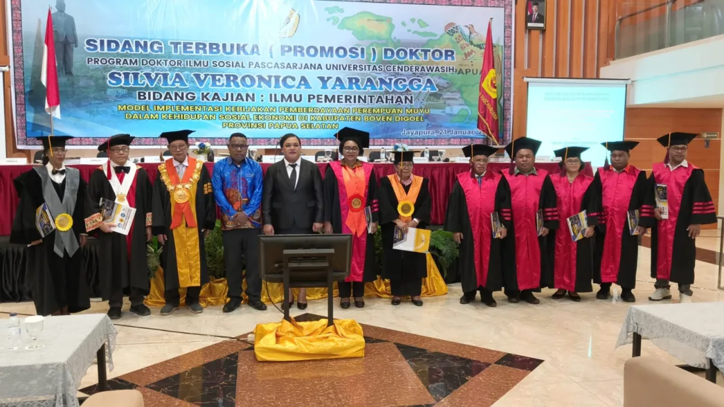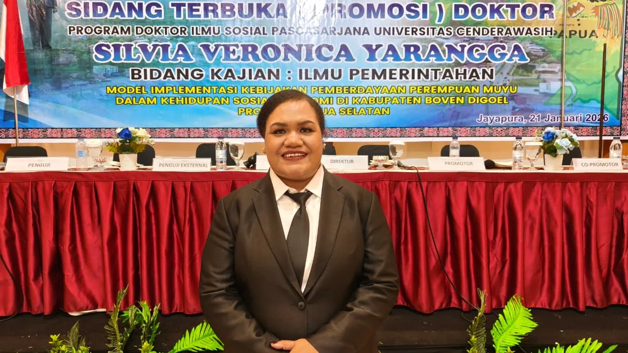 Berita Papua, Jayapura — Silvia Veronica Yarangga mencatatkan prestasi gemilang dengan meraih gelar doktor Ilmu Sosial bidang kajian Ilmu Pemerintahan dari Universitas Cenderawasih dengan IPK kumulatif 3,94.